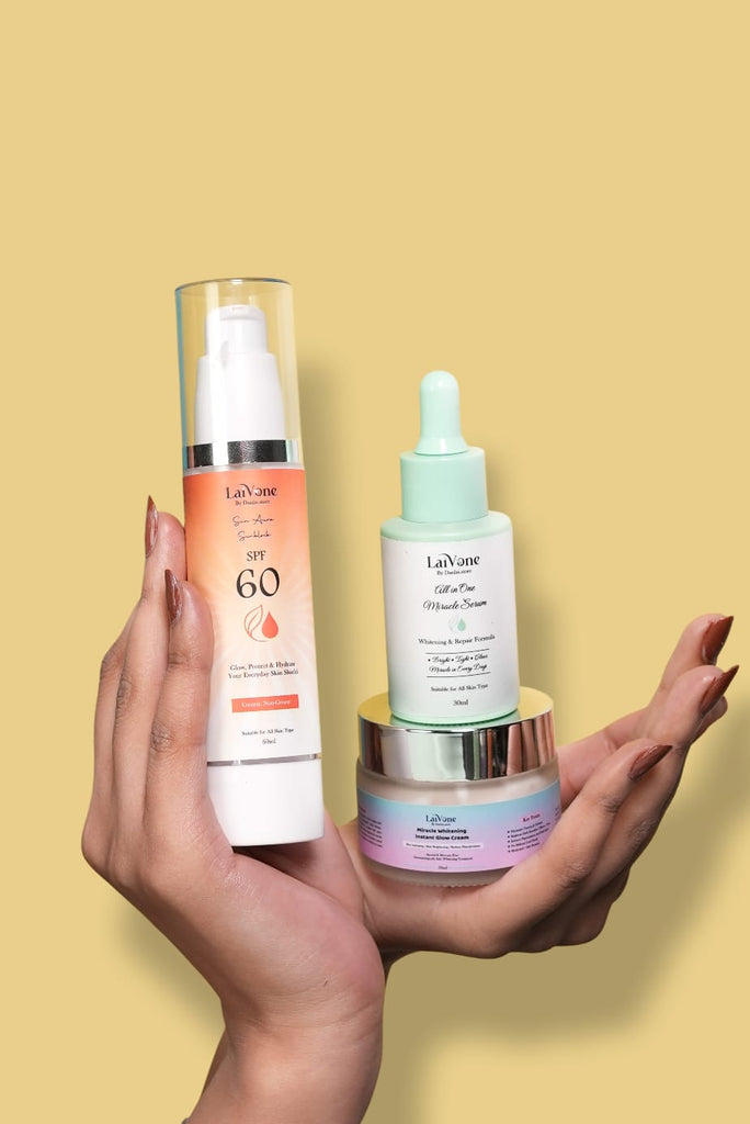 Achieve that radiant, flawless "Bridal Glow" every single day! The LaiVone Instant Bridal Glow Bundle is expertly curated for those seeking immediate radiance and long-term skin health. This powerful 3-step regimen—featuring our Miracle Serum, Instant Glow Cream, and Sun Aura Sunblock—works synergistically to repair dullness, brighten your complexion, and protect against harsh UV rays. Whether you are prepping for a special event or just want that daily "Glass Skin" look, this bundle is your ultimate secret to luminous beauty.